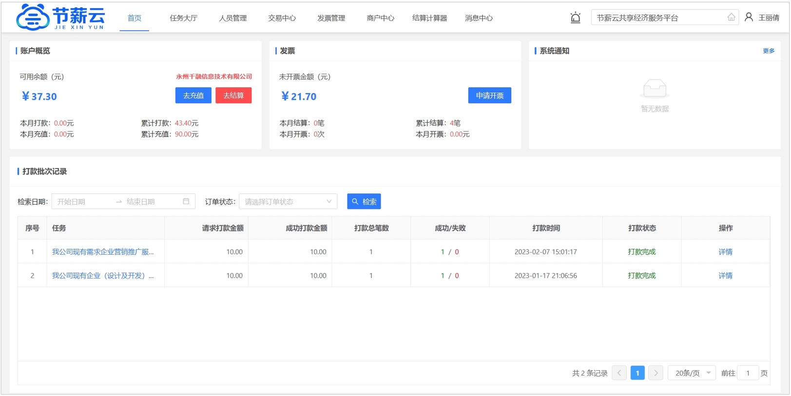 高效概覽賬戶詳情,充值發薪,申請開票人員簽約