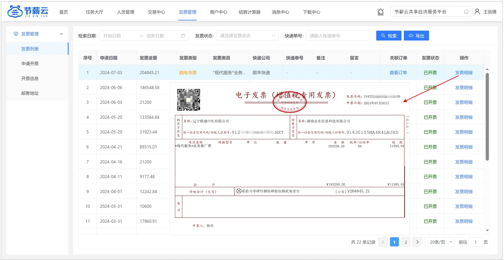 根據客戶開票申請,開具發票,實時更新快遞信息